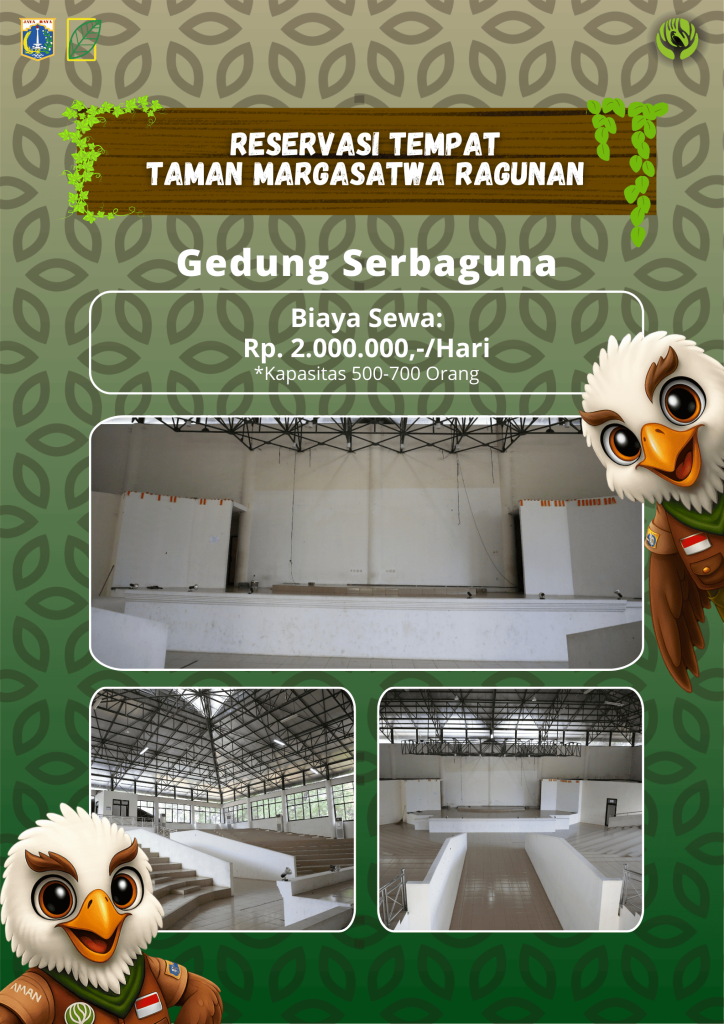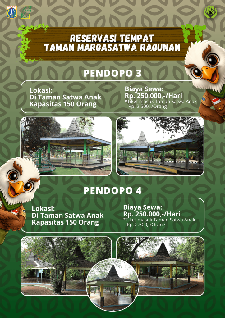 Pelayanan Pemakaian Fasilitas ( Taman Margasatwa Ragunan ) Tersedia beberapa ruang pertemuan sebagai berikut : Pendopo1,2,3, dan 4 Teras Informasi Gazebo Aula Serbaguna Lapangan